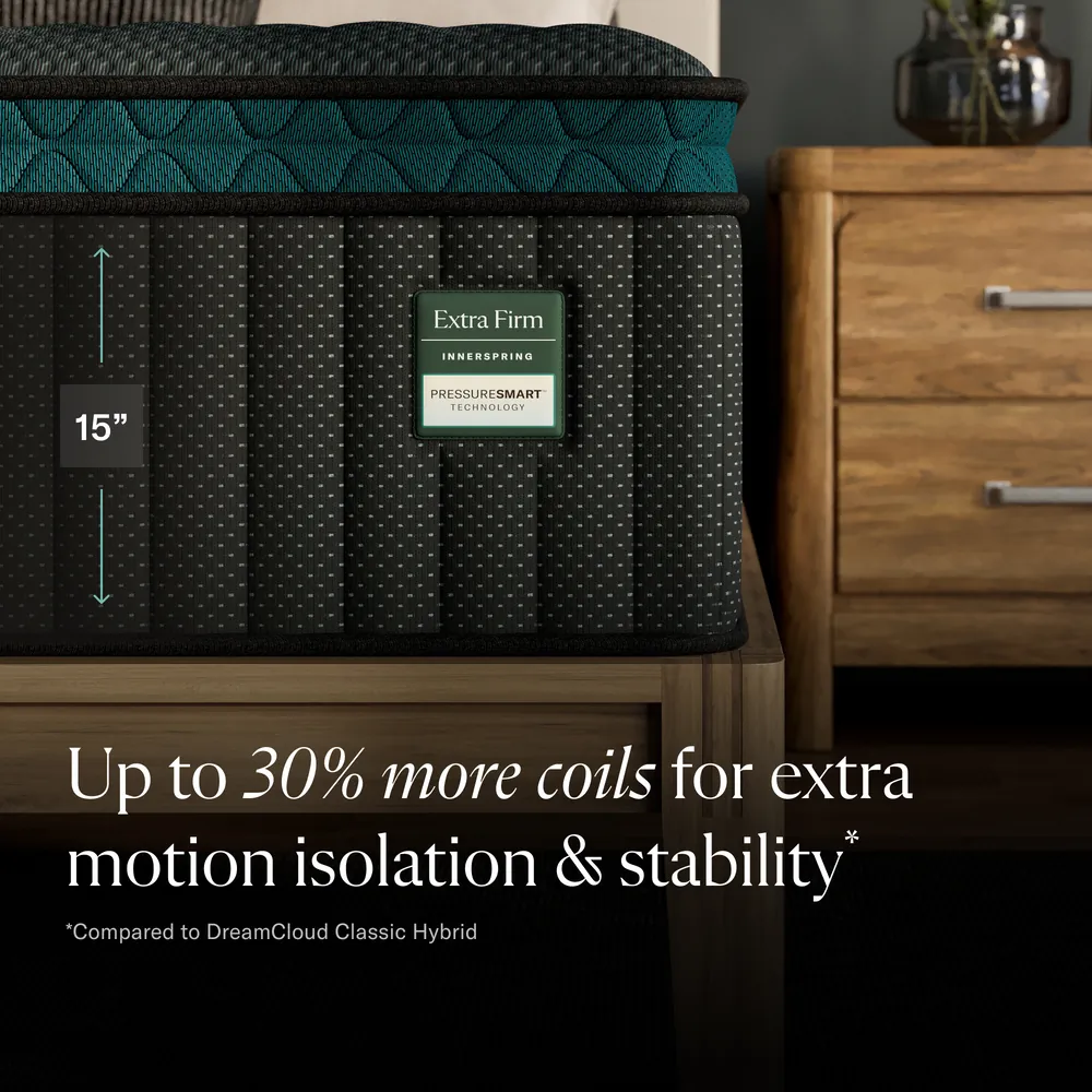 The DreamCloud PressureSmart™ Extra Firm Pillow Top delivers the solid, stable foundation serious sleepers need, with just enough contouring to maintain proper alignment. This mattress provides reliable firmness throughout while still responding to your body's natural curves, making it an ideal choice for back, stomach, and combination sleepers who prefer a more supportive surface.