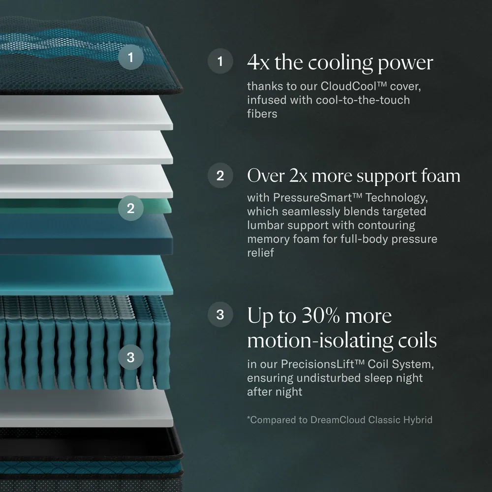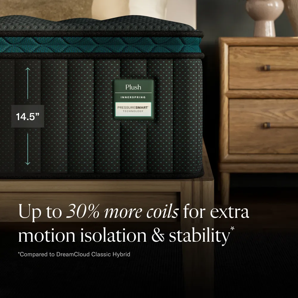 The DreamCloud PressureSmart™ Plush Pillow Top delivers the cradling comfort you need for truly restful nights, with responsive layers that contour to your body while maintaining dependable support. Enjoy plush, pressure-relieving softness while keeping your spine properly aligned — a natural fit for sleepers who want that luxurious, cloud-like feel.